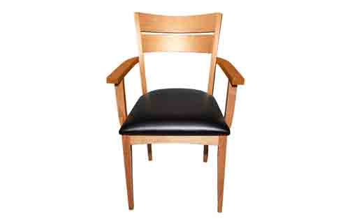 The Dalton arm chair is hand crafted from cherry wood. It features tapered legs and a black vinyl cushioned seat.