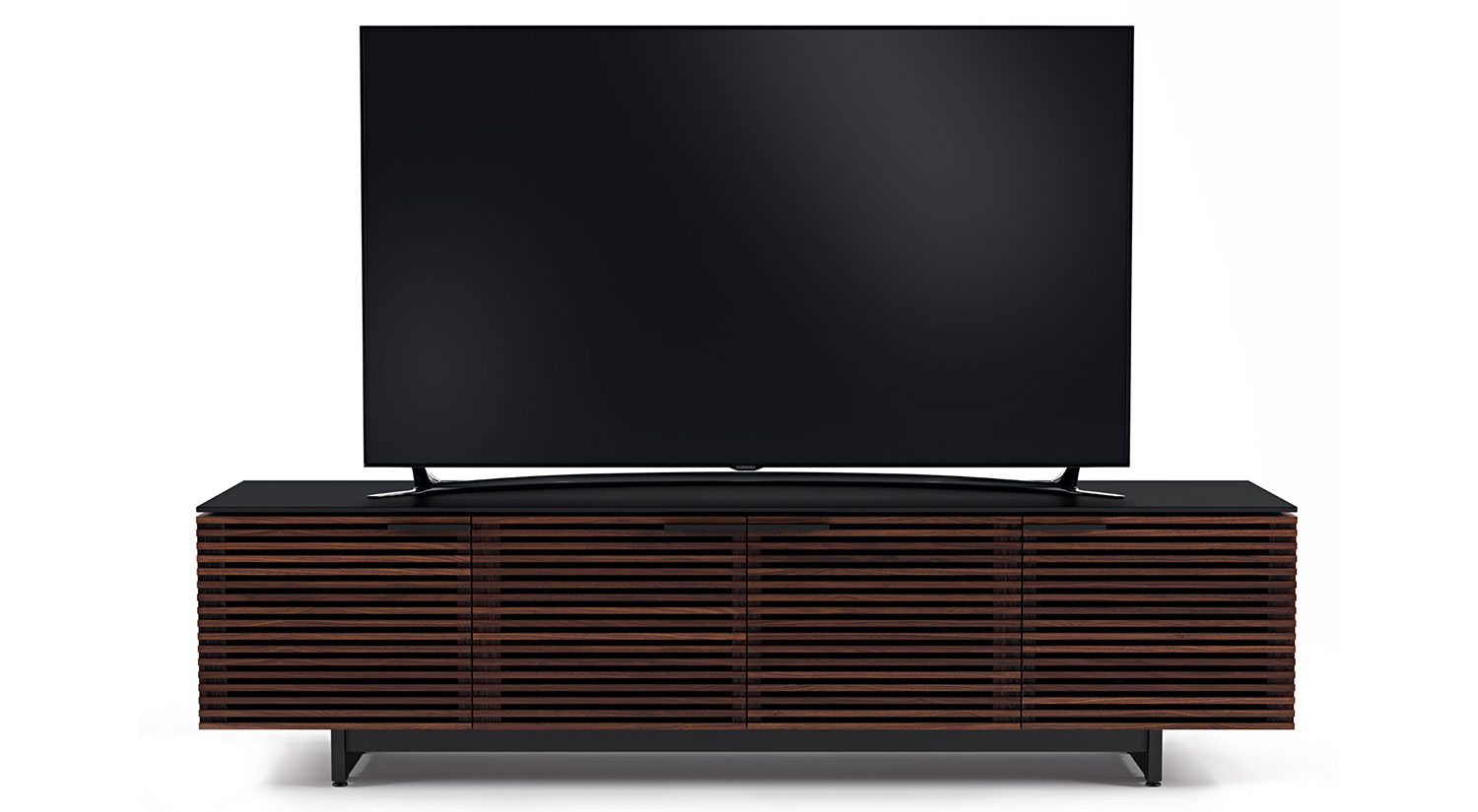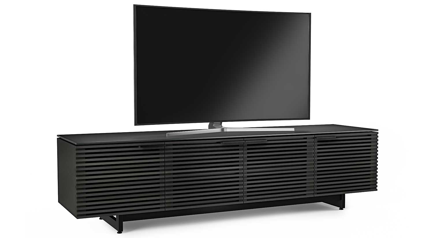 The Corridor Low Media Cabinet functions as a modern entertainment hub and packs a ton of innovative features into its low-profile design. Beautifully louvered doors conceal adjustable shelves, including a soundbar shelf, while allowing sound or a remote control’s signal to pass through clearly. It has a durable and soft-to-the-touch satin-etched tempered glass top to protect from dings, scratches, and fingerprints along with built-in cable management for organization.